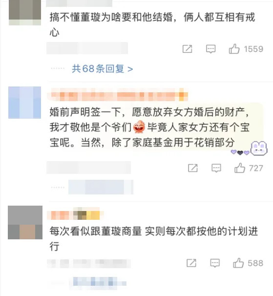 此外,自董璇、张维伊发布互动微博,正式官宣婚姻关系后,张维伊被网友吐槽婚前深情、婚后失责,他婚前承诺“不要孩子”婚后催生二胎,叫董璇女儿小酒窝“窝子”,多次在聚餐时因余额不足需董璇垫付费用,但其佩戴的劳力士手表价值高达30万元等行为引热议。